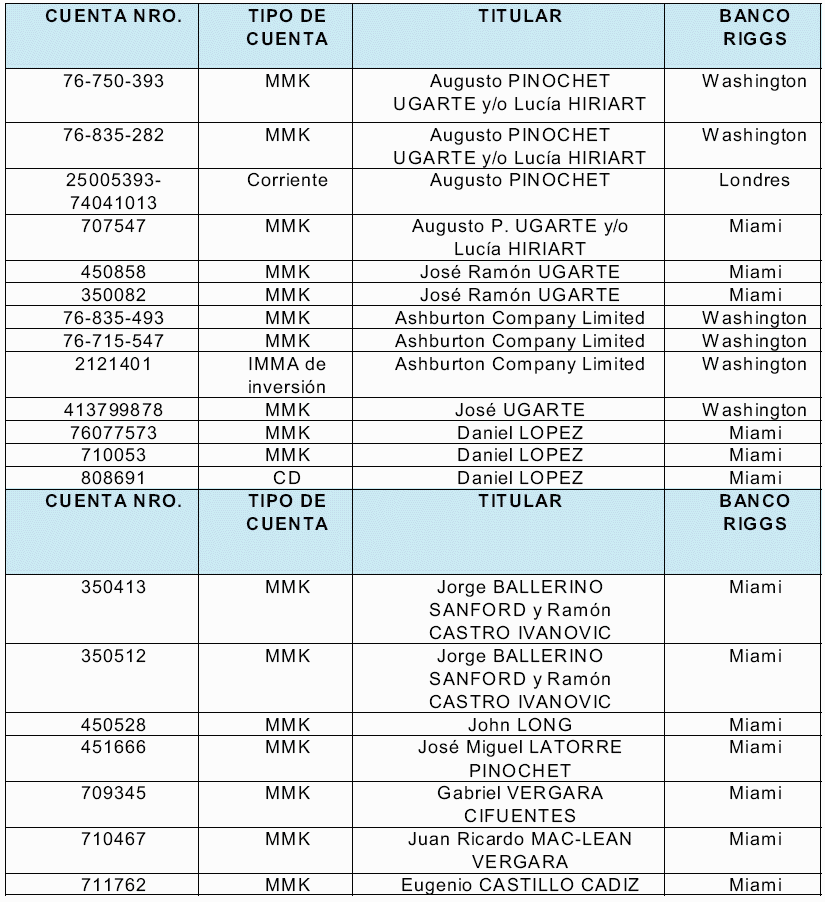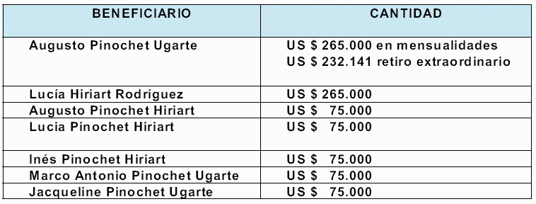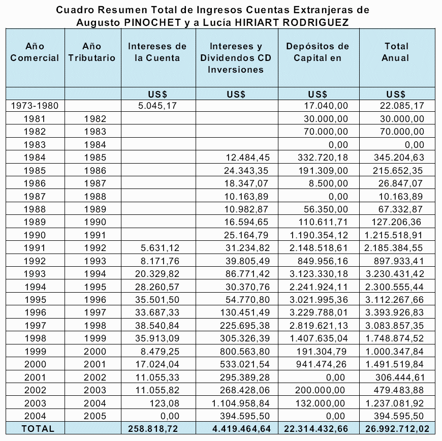 Inversiones en el extranjero.- Efectuado el recuento de los distintos depósitos y con la documentación reunida hasta ahora por el tribunal, en cuanto a capital, intereses y dividendos, de las inversiones de Augusto Pinochet Ugarte y Lucía Hiriart Rodríguez en el extranjero, suman un total de US $ 26.992.712,02. Los cuales resultan de la suma de cuentas en los Bancos Riggs de Londres; Riggs Washington; Riggs Miami; Espirito Santo de Miami; Banco de Chile Nueva York; Banco de Chile Miami, Lehman Brothers N.Y., Coutts Bank de Miami, Citibank N.Y., Citibank Miami, Cititrust Bahamas Limited, Firts National City Bank, Firts Tulsa a Bank of Amèrica, a lo que se suman transferencias de fondos desde los Bancos Atlántico de Nueva York; Banco Atlántico de Gibraltar; Banco Atlántico se Zurich; Bank of Bahamas; Sun Bank de USA; Swiss Corp; Bank of América; American Express Bank N.Y., Banco Océano Miami. Los cuales se desglosan en US$258.818,72 correspondientes al total de intereses generados por los saldos mantenidos en las cuentas; US$4.419.464,64 correspondientes al total de los intereses ingresados a las cuentas producto de los certificados de depósito, intereses de inversiones a través de las cuentas, dividendos obtenidos de los trusts, utilidades de inversiones y; US$22.314.432,66 correspondientes al total de los depósitos de capital ingresados a estas cuentas.