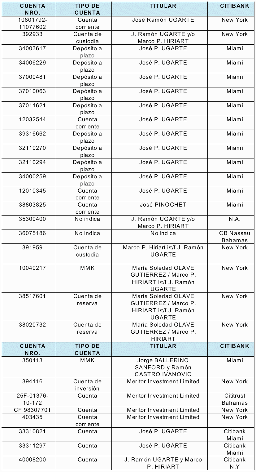 k.- Con fecha 07 de junio de 1985, abrió la cuenta personal N° 10040217 en el Citibank Nueva York bajo el nombre MARCO P. HIRIART, y posteriormente, en el mes de octubre de 1989, la modificó a MARCO P. HIRIART en fideicomiso a J. RAMÓN UGARTE y en mayo de 1999 la cambió en fideicomiso de su cónyuge, María Soledad OLAVE; cuenta que registró ingresos a contar del año 1993 por US$2.053.479, sin que se encuentre justificado su origen.