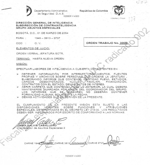 La Fiscalía también encontró la orden original, dirigida hacia los detectives con número de carné 1949, 3813 y 9737, que no deja duda sobre la violación a la intimidad y privacidad de las personas convertidas en blanco del DAS, así como el espionaje que se ejercía por aquella época en Colombia. Jimmy Galvis Caballero ordenaba a sus funcionarios "efectuar labores de inteligencia a cubierta" para "obtener información por internet, documentos, fuentes propias y archivos sobre personas que ordene la jefatura, elaborando informe que contenga identidad plena, estudios, cargos desempeñados, núcleo familiar, financiación, contratos con el Estado, demás datos de interés".