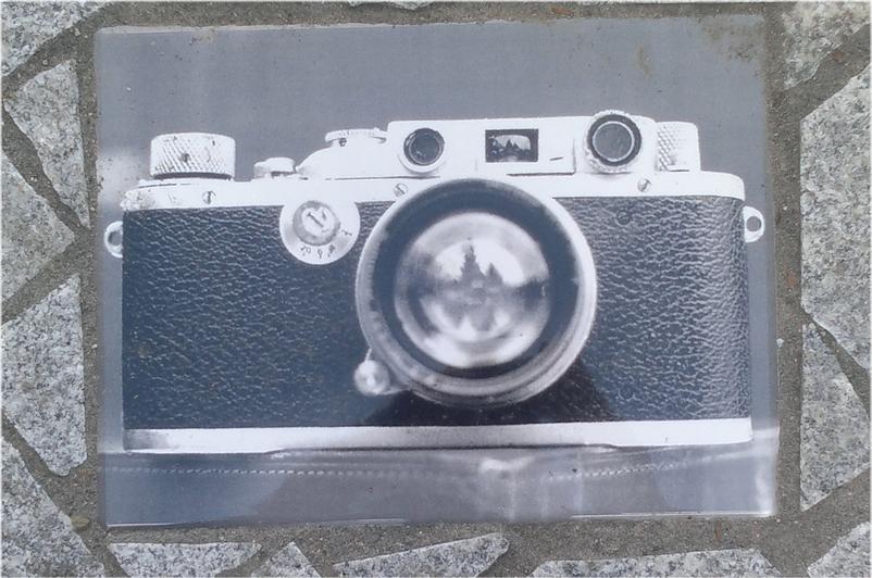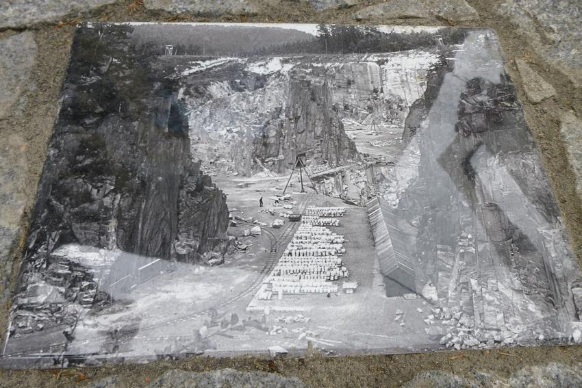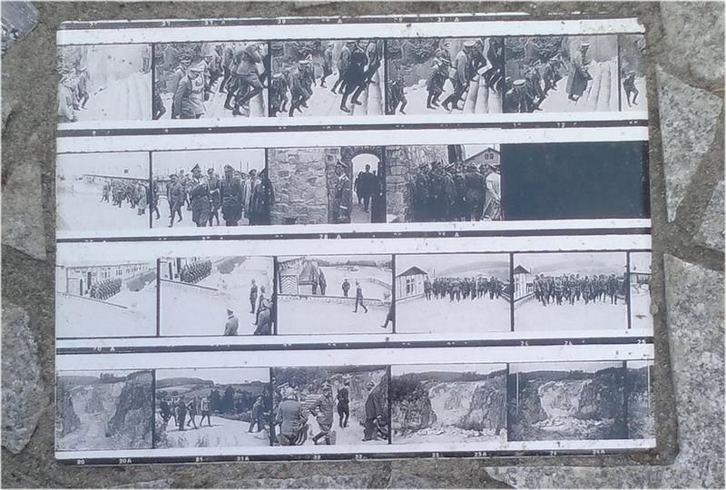 Le couloir de pierre conduisant à la plaque est parsemé de reproductions de quatre photographies liées à l'histoire d'Anna Pointner, du KZ Mauthausen et des républicains espagnols.
