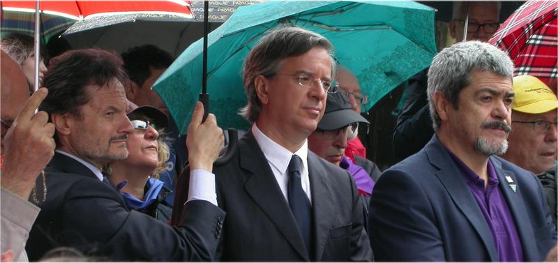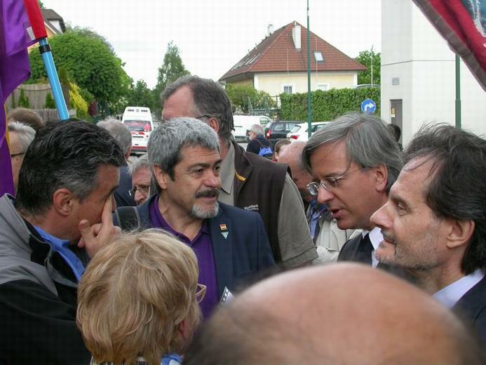 Enric Garriga Elies, président de l'Amicale de Mauthausen, discute aimablement avec Alberto Carnero Fernández, ambassadeur d'Espagne auprès de la République d'Autriche et José María Valdemoro Gímenez, ministre-conseiller de l'ambassade, lors de l'inauguration de la plaque en hommage à Anna Pointner, dans le village de Mauthausen.