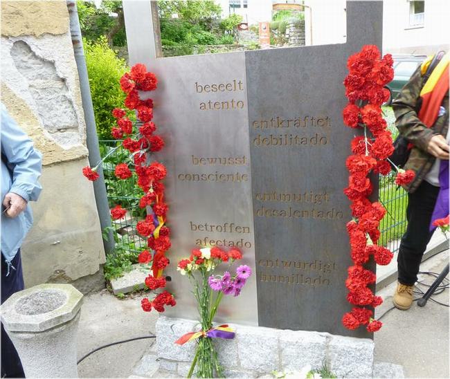 Vue de l'arrière de la plaque en hommage à Anna Pointner sur laquelle on peut lire : "Courageuse et exemplaire, elle défia le fascisme et aida les prisonniers espagnols du camp de concentration". Comme on peut le voir, aucune mention par rapport au fait que les prisonniers espagnols étaient républicains.