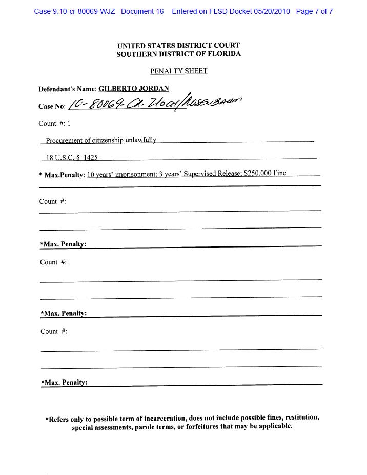 6. On or about September 10, 1996, in Palm Beach County, in the Southern District of Florida, the defendant, GILBERTO JORDAN, applied to naturalize as a United States citizen. Specifically, defendant GILBERTO JORDAN submitted an Application for Naturalization (Form N-400) to the Palm Beach Gardens, Florida, office of the Immigration and Naturalization Service which application defendant GILBERTO JORDAN affirmed under penalty of perjury was true and correct.