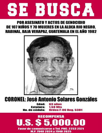 El mismo día 19 de Octubre se le entregó al fiscal Distrital del Ministerio Público, en su sede Distrital, ubicado en la cabecera departamental de Salamá, los paquetes de afiches con mensaje “SE BUSCA”, con impresión fotográfica del Coronel José Antonio Solares González, prófugo de la justicia, responsable intelectual de la masacre ocurrida en Río Negro, como se podrá apreciar en la fotografía impresa en el presente documento.