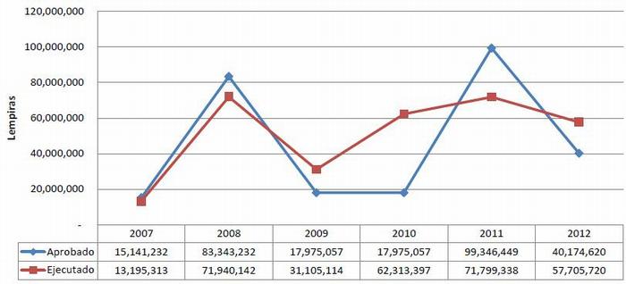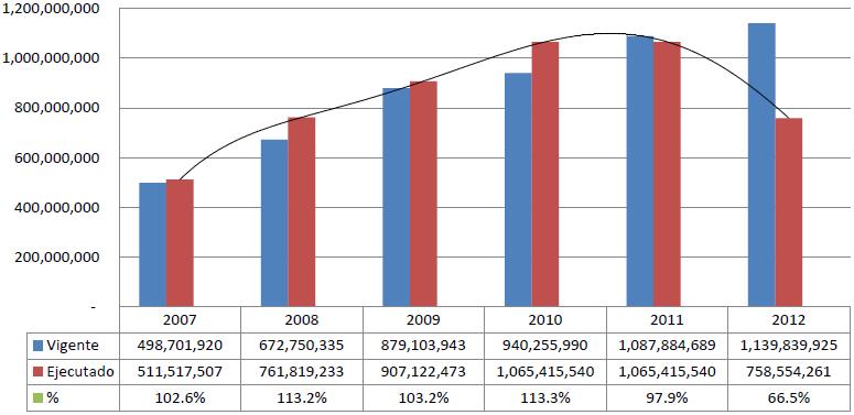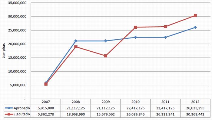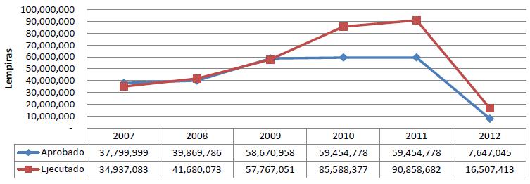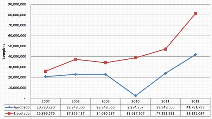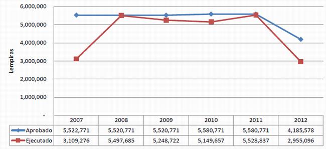 Este gráfico muestra claramente que la ejecución del presupuesto del Hospital Escuela supera los montos aprobados originalmente, evidenciando la falta de procesos de formulación presupuestaria. También puede verse que en el periodo en curso (2012), al 24 de julio se había ejecutado el 66.5 % de los recursos, siendo esta una realidad crítica, ya que en ese periodo debería haberse ejecutado únicamente el 58.3 % y nos arrojará un déficits para concluir el año; además demanda la necesidad de un presupuesto real.