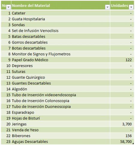 En este cuadro se puede apreciar, que el desabastecimiento de materiales esenciales es dramático, ya que el HE cuenta únicamente con Jeringas, agujas, biberones y papel grado médico; y productos como guantes, suturas, catéteres, algodón, gasas, sondas, hojas de bisturí y mascarillas para mencionar algunos, no forman parte del inventario actualmente.