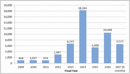 Figure 4. Unaccompanied Honduran Minors Encountered by U.S. Border Patrol: FY2009-FY2017