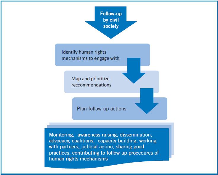 Civil society's work on follow-up is thus more effective when it has engaged in the full process. While sustained engagement throughout all phases of the cycle of activities of human rights mechanisms is likely to yield more results, CSAs can usefully benefit from the outcomes and recommendations of human rights mechanisms even without previous engagement.